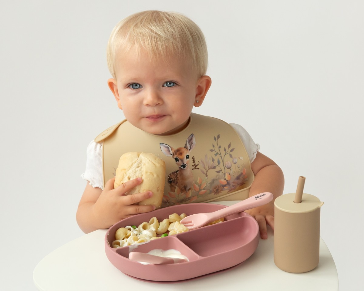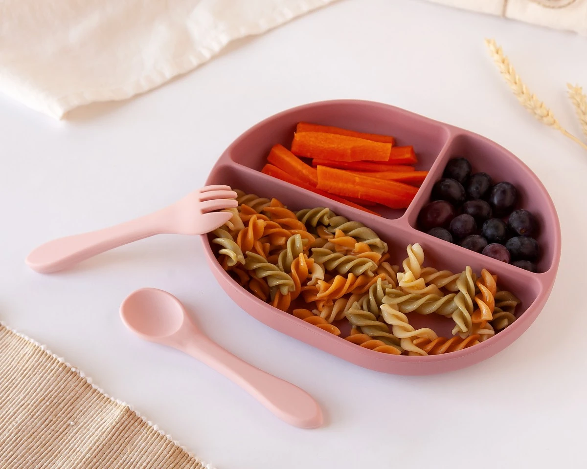 CONJ. DE TALHERES E BANDEJA BLW EM SILICONE COM DIVISÕES ROSA 3U
